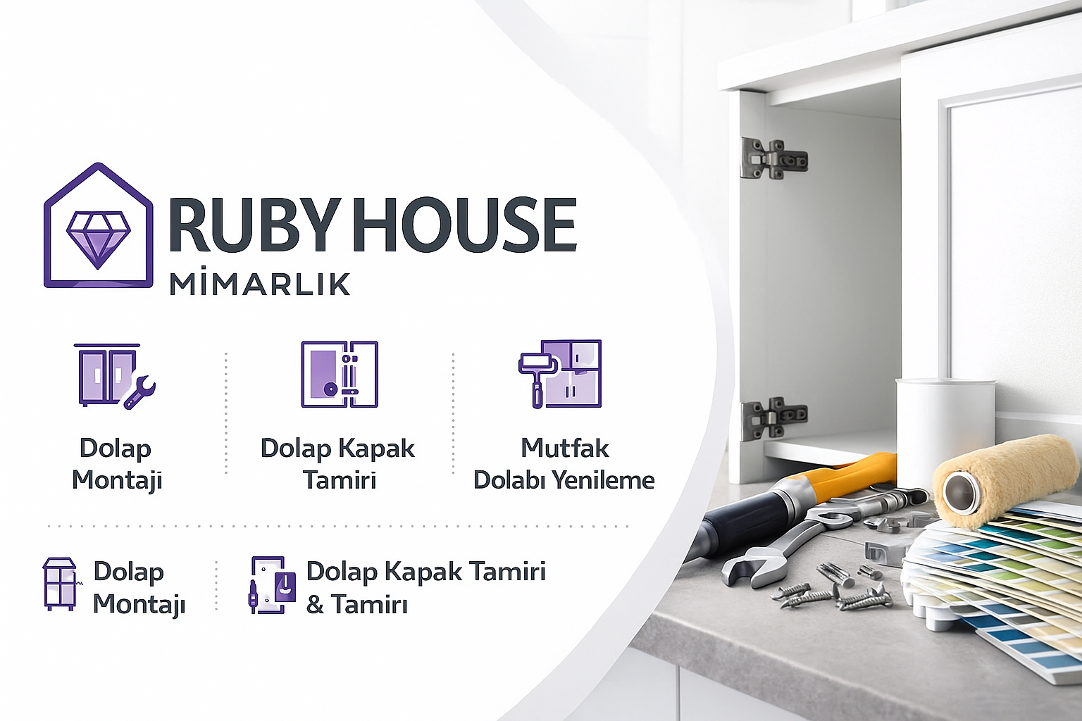 Rubyhouse Mimarlık olarak; dolap montajından kapsamlı tadilata, mutfak yenilemeden özel mobilya uygulamalarına kadar aklınızdaki tüm projeleri profesyonel ekibimizle hayata geçiriyoruz.